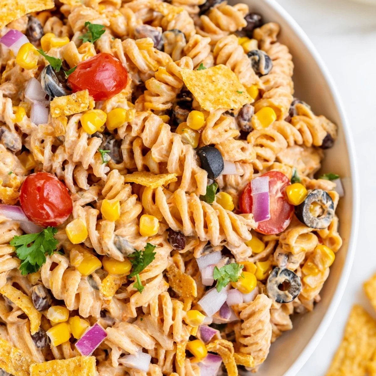 This pasta salad shines at potlucks and barbecues because it travels so well and does not need to be kept piping hot. I love serving it alongside grilled chicken or as part of a taco bar spread. It also makes excellent leftovers for lunch the next day though you might want to pack the tortilla chips separately.